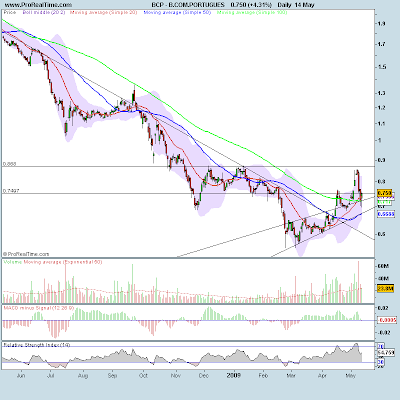 Tecnicamente o movimento de descida acentuada, e com forte volume, efectuado após o anúncio dos resultados, também era esperado, devido à aproximação da zona de resistência nos 0,87€. A quebra desta resistência dará um novo animo às cotações do banco, com a possibilidade de inversão da tendência de médio-prazo de descida para subida.